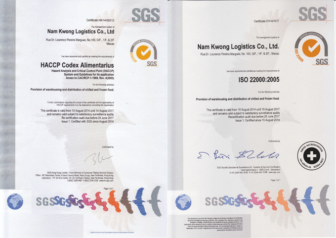 In the first half of 2014, the affiliated frozen warehouse of Nam Kwong Logistics affiliated frozen warehouse, under the care and support of the company, under the professional guidance of the external consultant company, and with the joint efforts of all colleagues, was managed to obtain the dual qualification certificate of food safety management system under SGS Hong Kong Limited and HACCP. Since then, it has become the first logistics company in Macau with the dual qualifications. The approval of the dual qualifications means that the logistics company's operation procedures, such as warehousing and distribution of food goods, are in line with the standards of the international food supply chain, which could provide customers with confidence and quality assurance. As a result, the logistics company has taken a critical step in the management of frozen food supply chains.