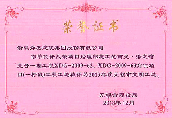 On April 17, the first phase of the Wuxi project was awarded the 2013 Wuxi City-Level Civilized Construction Site in the assessment by Wuxi Construction Bureau. On June 18, it was also awarded the 3rd Batch of 2013 provincial-level civilized construction site in the assessment by Jiangsu Provincial Department of Housing and Urban-Rural Construction.
